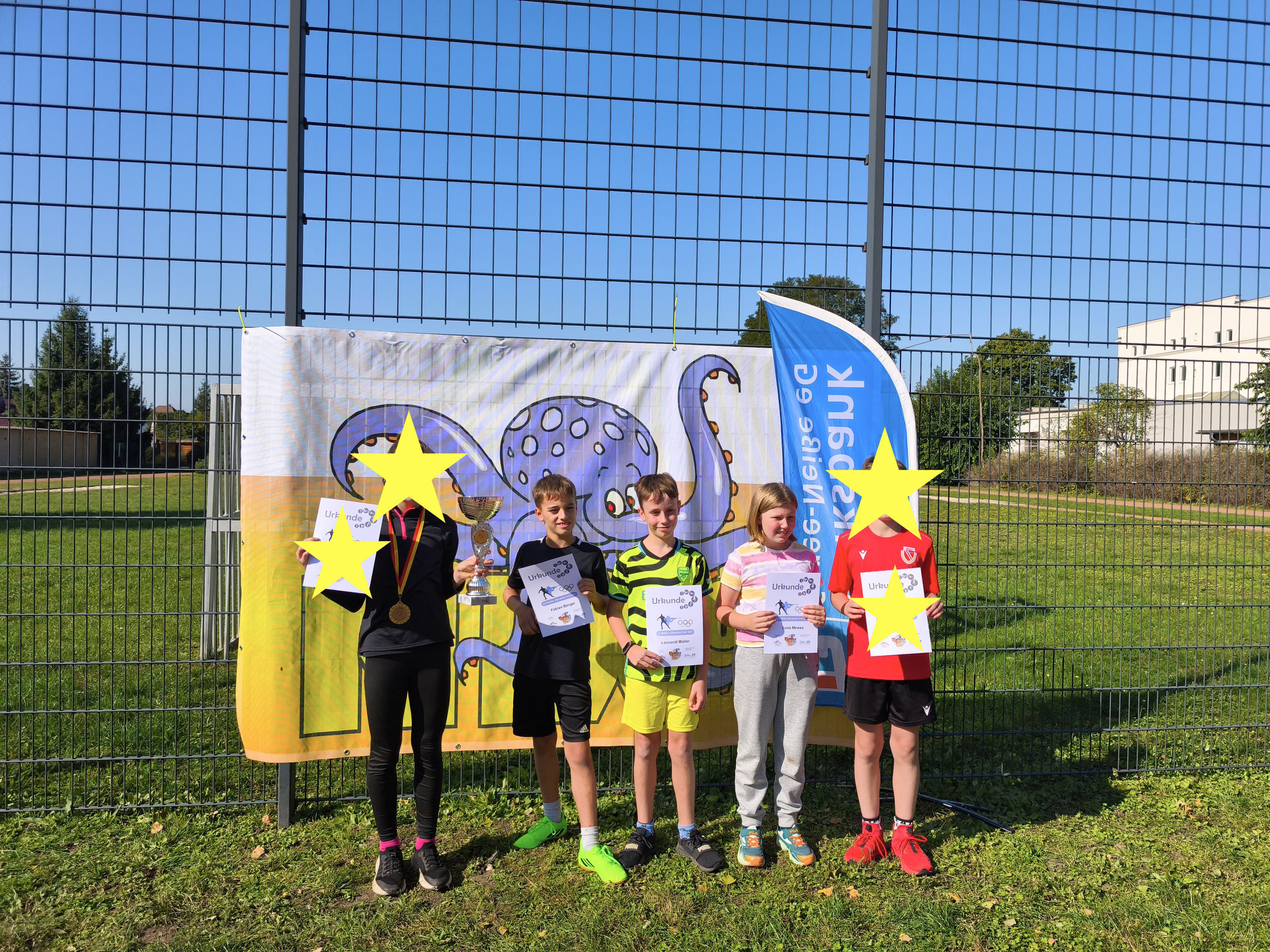 Bei herrlichem Herbstwetter hieß es am Samstag (27.09.25) schnell rennen und ebenso gut zielen an der Laserschussanlage. Teilgenommen haben insgesamt 40 sportbegeisterte Kinder aus vier Grundschulen. Im Einzelwettbewerb der Mädchen belegte Julia-Maily Hepp aus der 5.Klasse den 1.Platz. Besonders spannend wurde es beim abschließenden Staffelwettbewerb der Grundschulen. Gemeinsam als Team kämpften sich die Kinder der 5. und 6.Klasse an die Spitze des Feldes und holten sich den Sieg. Bei der Siegerehrung hielten Ansgar, Luna, Julia-Maily, Fabian und Lennardt den Pokal stolz in die Luft.